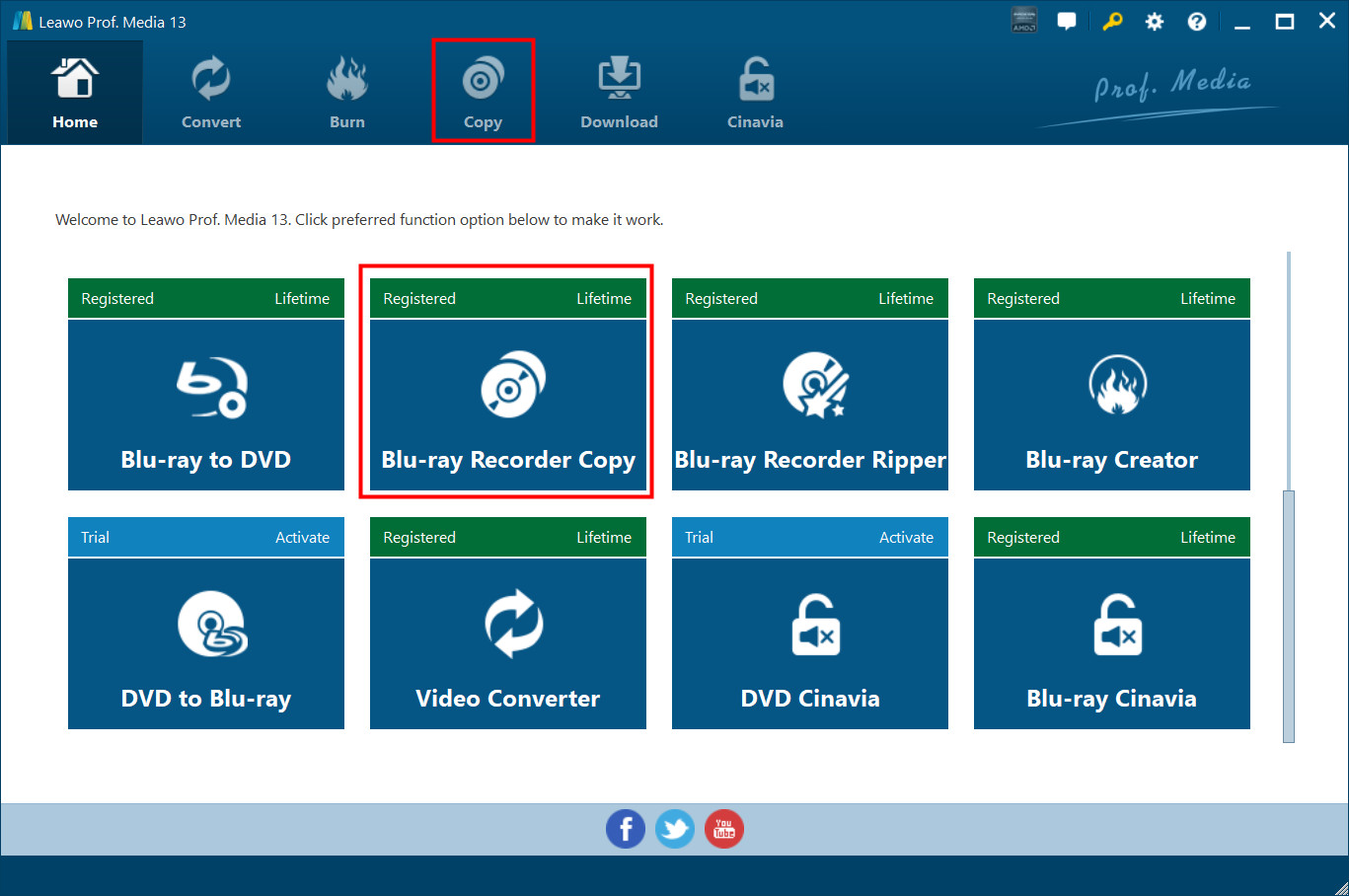 After installing Leawo Prof. Media on your computer, kick it off. Click the "Copy" tab on the top or "Blu-ray Recorder Copy" option in the middle to enter the Blu-ray Recorder Copy module.