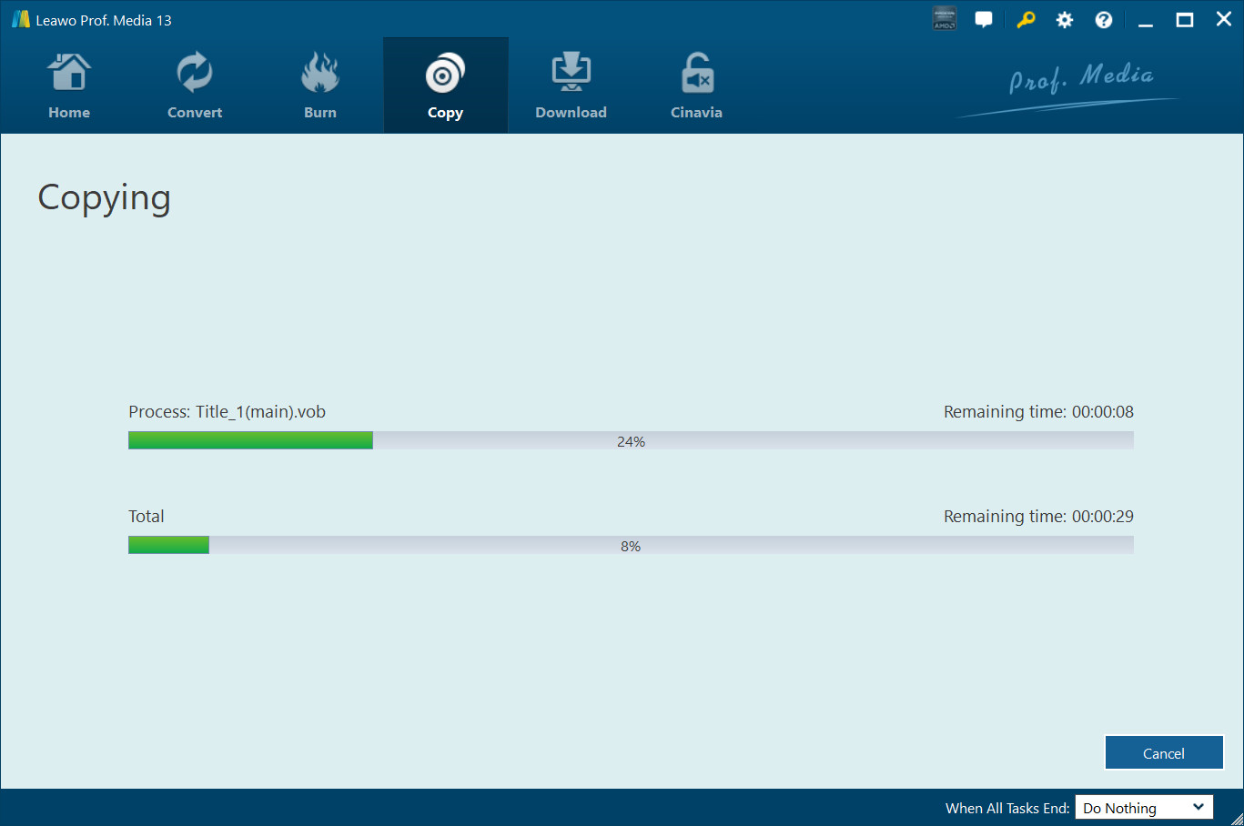 Finally, click the "Copy" button at the bottom of the sidebar to start copying BDAV to blank disc or computer hard drive. Then you will see the "Copying" panel, which showcases you the detailed copying progress. You could cancel/stop copying BDAV files anytime you like, and set after-done operation at the bottom right corner.