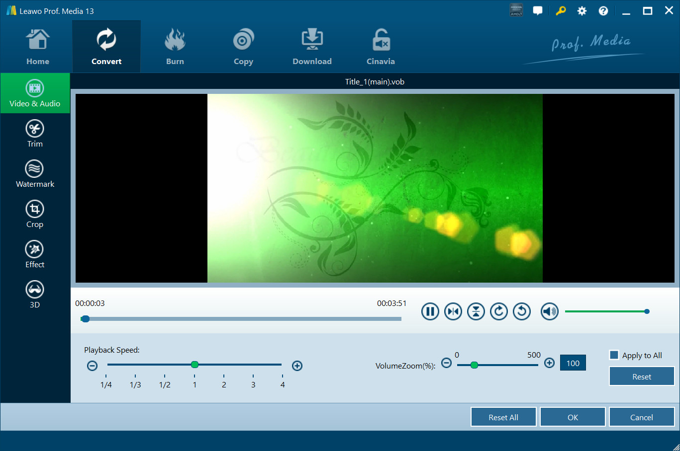 On the "Video & Audio" tab, you could adjust the playback speed from 1/4X to 4X, change the Volume Zoom, and rotate video for special angle of view.