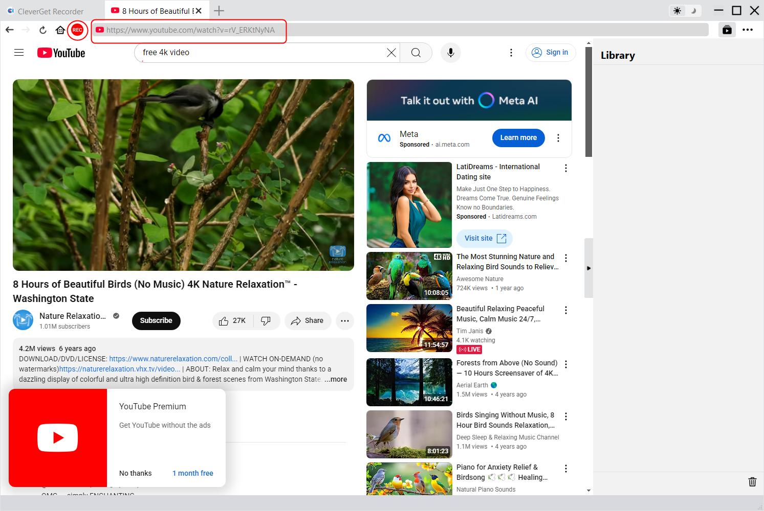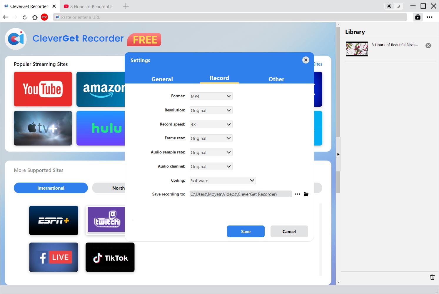 You could view entire recording process on the recording toolbar, stop recording and then restart recording any time you like. CleverGet Recorder will generate a recording file every time you stop the recording. All recordings are available on the right sidebar, which could be opened/hidden by clicking the "Library" icon