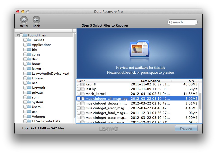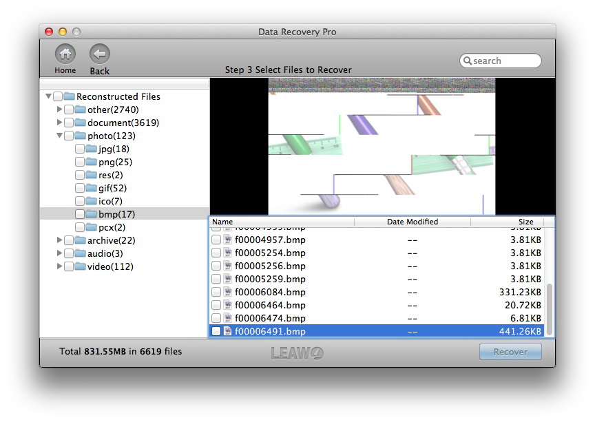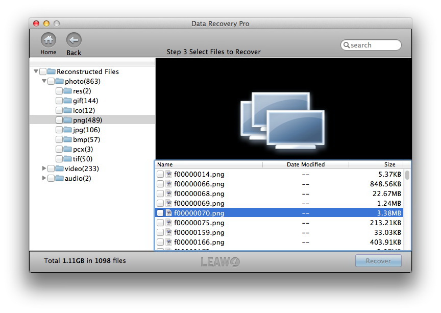 After scanning, all files found presenting on the left side of the software. Both Reconstructed Files and Found Files are accessible. You have the chance to preview the image or document file. Make a selection on the files you want to recover and click on the "Recover" button. Select a path on you Mac to save files and it is suggested that you save the recovered files on another drive in case of files be overwritten.