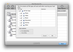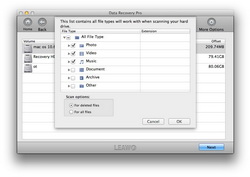 After cylinder analyzing, you will get volumes, then select the target volume for file scanning. Click on the "More Options" button and you can see a list containing all file types, pick up those you want for scanning. Scan all files by checking "For all files" and scan lost files only by checking "For deleted files".