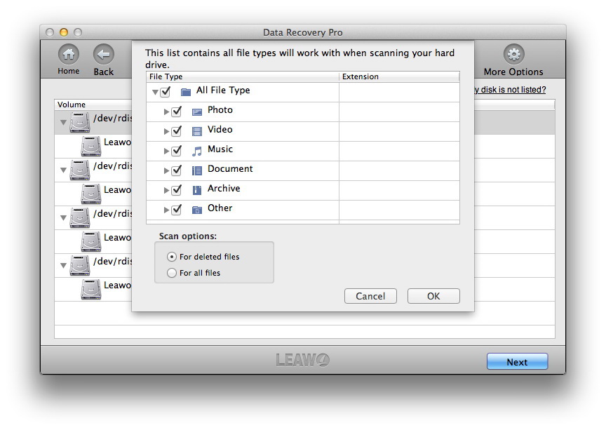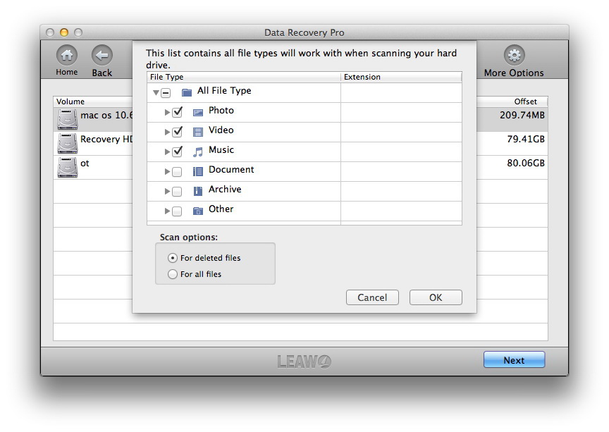 When you choose "File Recovery" mode, you will get into the following interface. Select the drive or volume you want to recover data from. Click on the "More Options" button on the top right corner to choose files for scanning. By default, all file types will be checked. With "For deleted files" checked, only lost files will be scanned. With "For all files" checked, all files will be scanned.