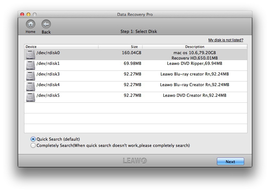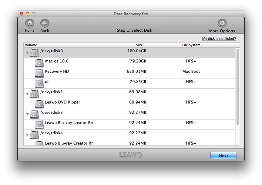Select a disk to be analyzed by this data recovery software for Mac. Tab on "Next" button to head to the next step.