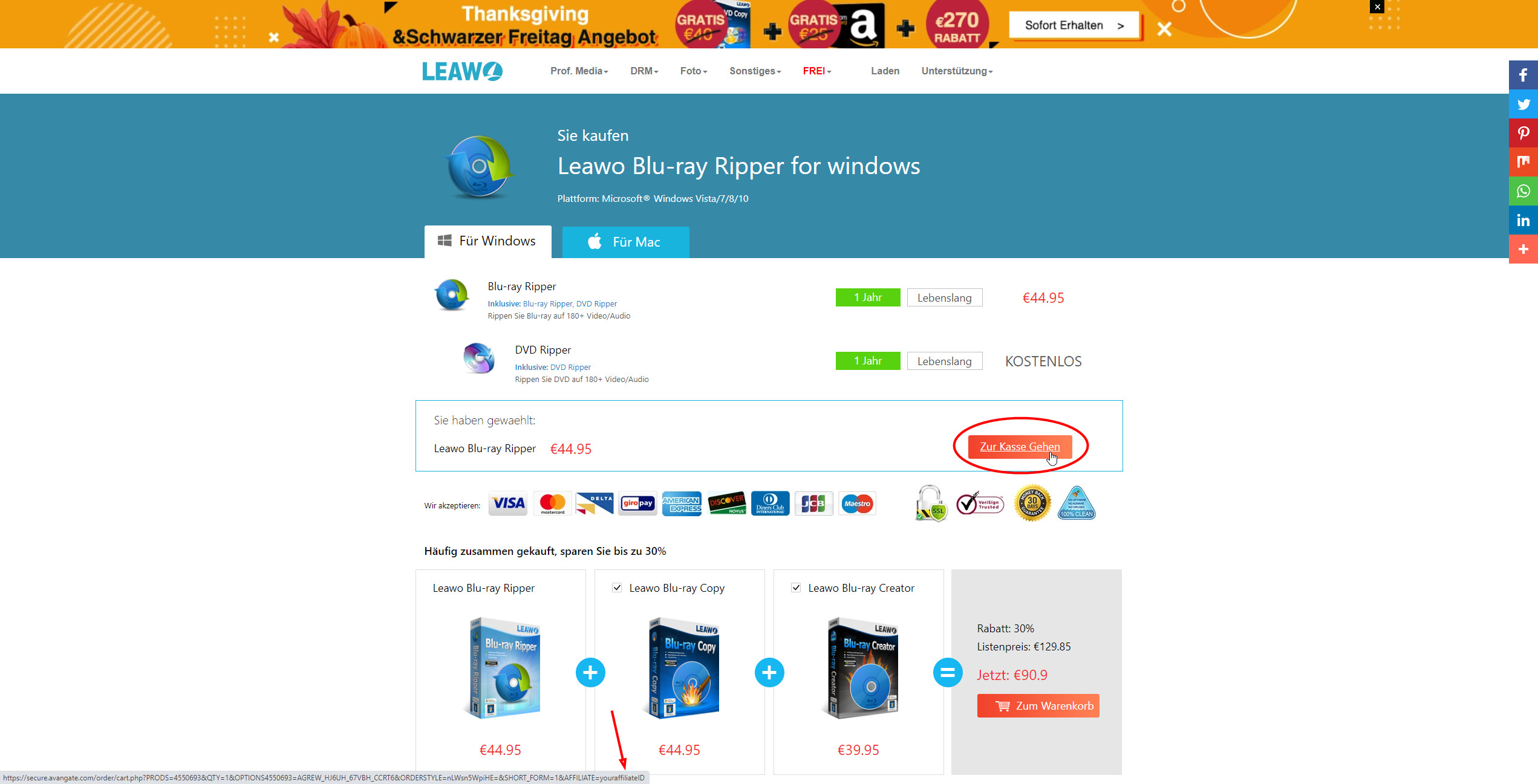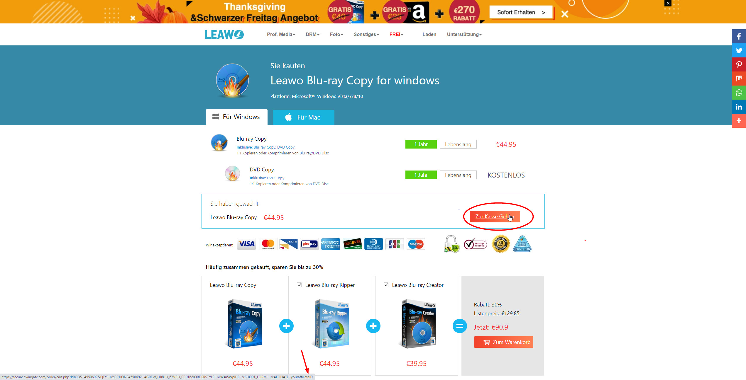 klicken, um Leawo Blu-ray Copy zu kaufen, sehen Sie, dass Ihre Affiliate-ID auch im Kauflink www.avangatenetwork.com enthalten ist. Sehen Sie dazu die untere linke Ecke des unteren Bildes.
