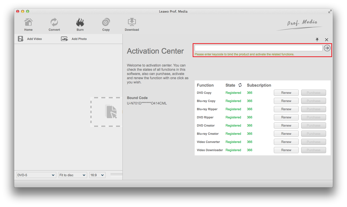 Mit der Testversion können Sie nur eingeschränkte Funktionen von Leawo Blu-ray Copy nutzen. Um die voll funktionsfähige Blu-ray Copy für Mac nutzen zu können, müssen Sie das Programm registrieren. Nachfolgend erfahren Sie, wie Sie das Programm registrieren können.