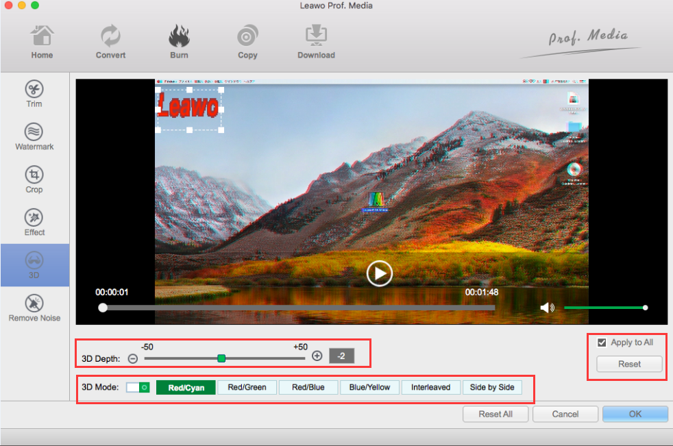 Unter " 3D " können Sie Ihr 2D-Video in 3D verwandeln. Klicken Sie auf die Schaltfläche 3D-Modus, um den 3D-Effekt zu aktivieren. Es stehen 6 Arten von 3D-Modi zur Verfügung. Sie können 3D-Modi aus Rot/Cyan, Rot/Grün, Rot/Blau, Blau/Gelb, Verschachtelt und Side by Side auswählen. Und Sie können den Wert der 3D-Tiefe anpassen, indem Sie den Schieberegler anpassen oder einen Wert eingeben.