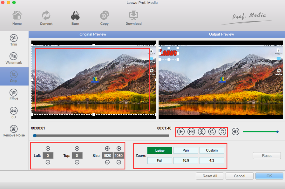 In " Ausschneiden " können Sie einen Teil der Filmleinwand auswählen und andere Teile entfernen. Es gibt zwei Möglichkeiten, das Video auszuschneiden: eine besteht darin, direkt einen Teil des Bildschirms im Vorschaufenster auszuwählen, eine andere darin, die Koordinaten von links und rechts sowie den Größenwert einzugeben.