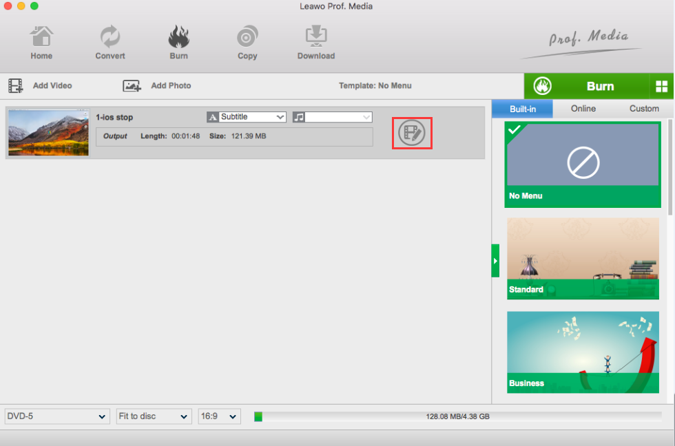 Das Video kann vor dem Brennen auf DVD oder Blu-ray bearbeitet werden. Um das Videobearbeitungsfenster aufzurufen, klicken Sie auf die Schaltfläche Bearbeiten