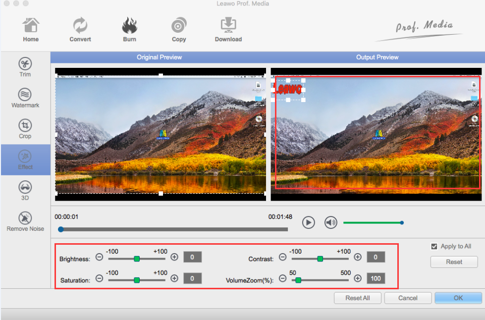 Unter "Effekt" können Sie Helligkeit, Sättigung, Kontrast und Lautstärke des Videos einstellen. Sie können den Schieberegler direkt ziehen oder einen Wert eingeben, um sie anzupassen. Und Sie können sich das angepasste Bild im Vorschaufenster ansehen. Aktivieren Sie Auf alle anwenden