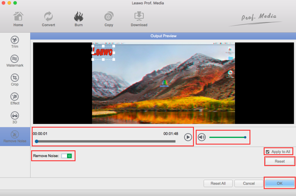 ein. Sie können Ihr Video in der Vorschau ansehen und die Lautstärke Ihres Videos anpassen, bis Sie mit der Klangqualität zufrieden sind. Klicken Sie wie gewohnt auf Zurücksetzen, um Ihre Einstellungen rückgängig zu machen. Wenn Sie die Einstellung vorgenommen haben, aktivieren Sie das Kontrollkästchen "Auf alle anwenden" und klicken Sie auf die Schaltfläche "OK".