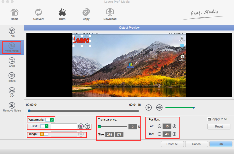 3.4 Sie können das Wasserzeichen auf alle Videos anwenden, indem Sie Auf alle anwenden aktivieren. Sie können das Wasserzeichen rückgängig machen, indem Sie auf die Schaltfläche Zurücksetzen klicken.