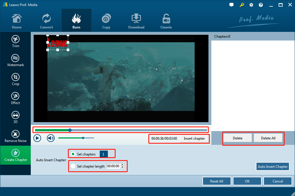 Im Abschnitt Kapitel erstellen können Sie das Kapitel einstellen wählen, um Kapitel zu erstellen, indem Sie die Nummer direkt eingeben, oder die Kapitellänge festlegen wählen, um den Wert jeder Kapitellänge einzugeben. Sie können Kapitel auch einzeln einfügen und bearbeiten, indem Sie den Schieberegler so weit ziehen, dass Sie das Kapitel erstellen möchten. Klicken Sie dann auf Kapitel einfügen, um das Kapitel zu erstellen. Wenn Sie mit dem Erstellungsergebnis des Kapitels nicht zufrieden sind, können Sie auch auf Löschen oder Alle löschen klicken, um die Kapitel zu löschen. Diese Funktion ist nur für die Ausgabe von Blu-ray verfügbar.