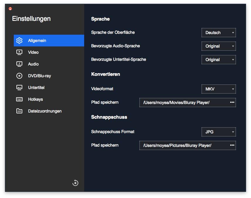 Das Einstellungsfeld "Allgemein" umfasst Einstellungen für Sprache, Konvertierung und Schnappschuss. Sie können die Sprache der Benutzeroberfläche, die bevorzugte Audiosprache, die bevorzugte Untertitelsprache, das Ausgabevideoformat, den Standardpfad für die Konvertierung von Blu-ray/DVD in MKV, das Schnappschussformat und den Pfad zum Speichern des Schnappschusses festlegen.