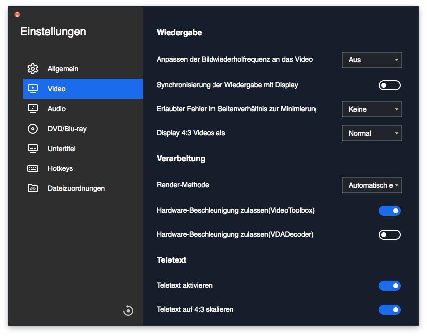 Im Einstellungsbereich "Video" können Sie die Wiedergabe-, Verarbeitungs- und Teletexteinstellungen anpassen. Sie können die Aktualisierungsrate der Anzeige, die Synchronisierung der Wiedergabe mit der Anzeige, das Anzeigeformat, die Rendering-Methode, die Hardware-Beschleunigung usw. einstellen.