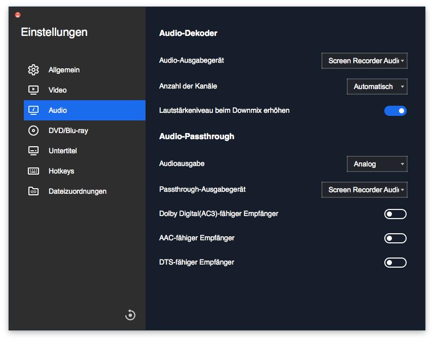 Im Einstellungsfeld "Audio" können Sie Audioausgang, Lautsprecherkonfiguration, Lautstärkeanhebung bei Downmix, Stereoausgabe an alle Lautsprecher, Audioausgabegerät, Wiedergabe von GUI-Sounds usw. einstellen.