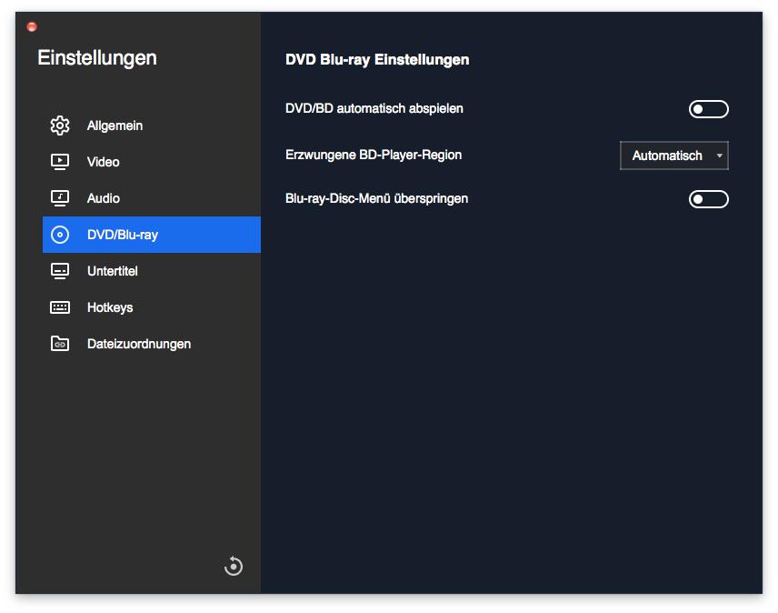 Im Einstellungsfeld "DVD/Blu-ray" können Sie festlegen, ob die DVD/Blu-ray automatisch abgespielt werden soll oder nicht, die Region des BD-Players erzwingen und die Einleitung vor dem DVD/Blu-ray-Menü überspringen oder nicht.