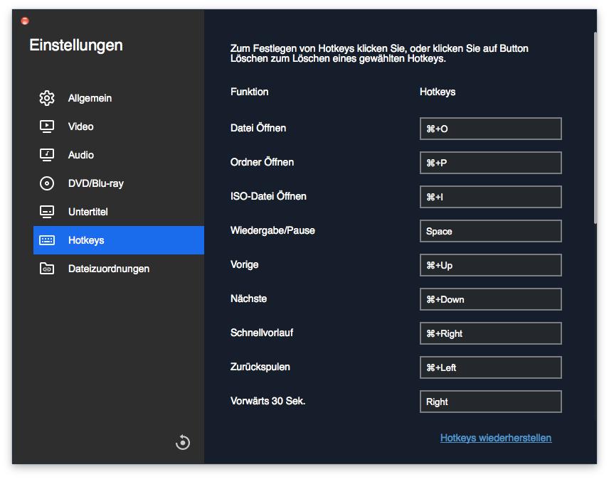 Auf dem Einstellungsfeld "Hotkeys" können Sie Hotkeys für verschiedene Operationen einstellen, z. B. Datei öffnen, Ordner öffnen, ISO-Datei öffnen, Wiedergabe/Pause, vorherige/nächste Wiedergabe usw.