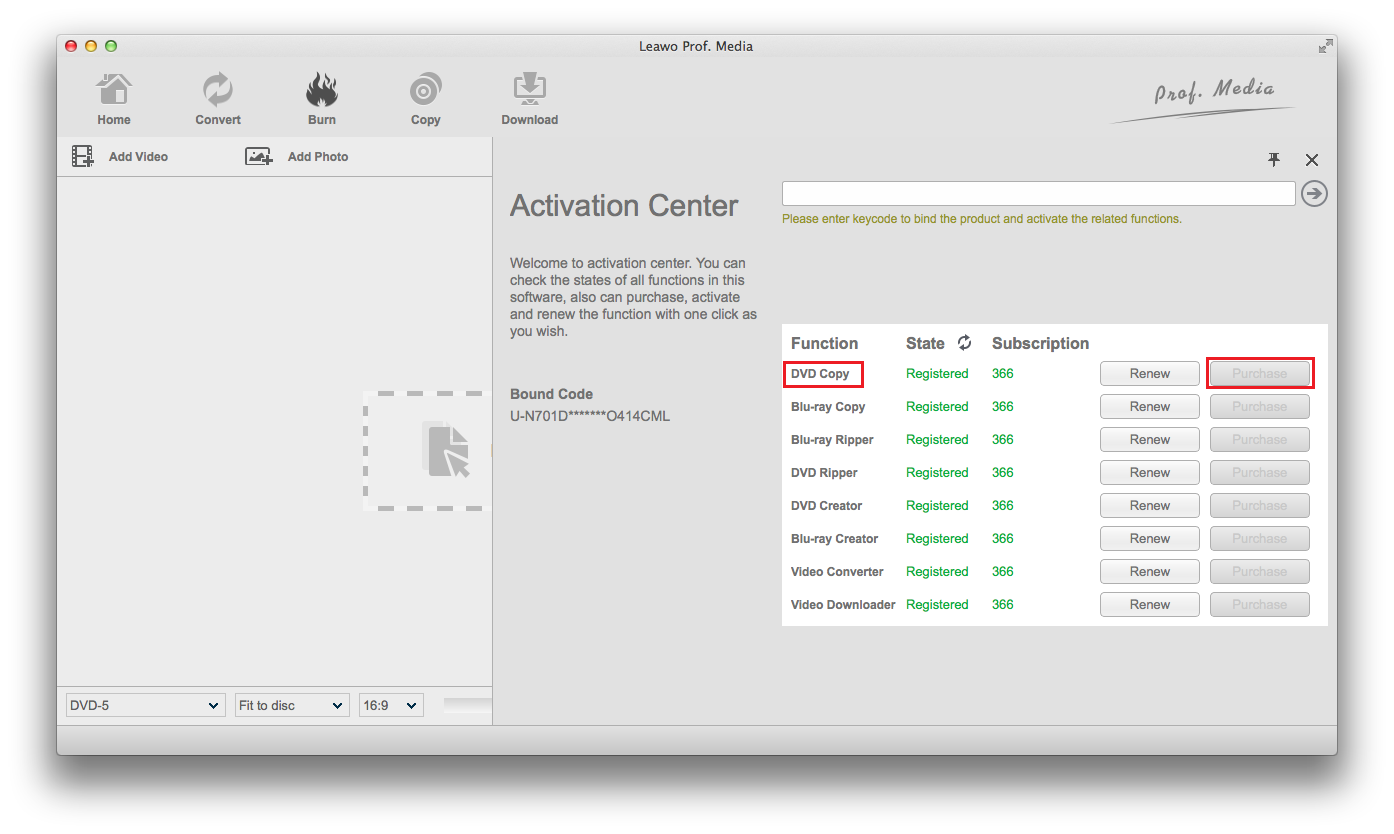 Oben auf dem Bedienfeld des Aktivierungscenters befindet sich das Feld, in dem Sie den Registrierungscode eingeben und das Programm aktivieren können. Wenn Sie den Registrierungscode für das Programm schon einmal gekauft haben, können Sie den Code hier direkt einfügen oder eingeben, um alle Funktionen von Leawo DVD Copy für Mac zu aktivieren.