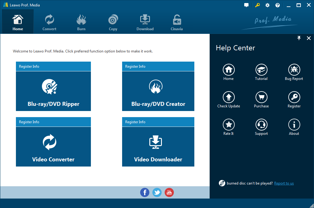 recht oben auf der Oberfläche, um ins Hilfecenter zu gelangen. Öffnen Sie die Produktseite von Leawo Prof. Media durch Klicken auf “Home”-Taste.