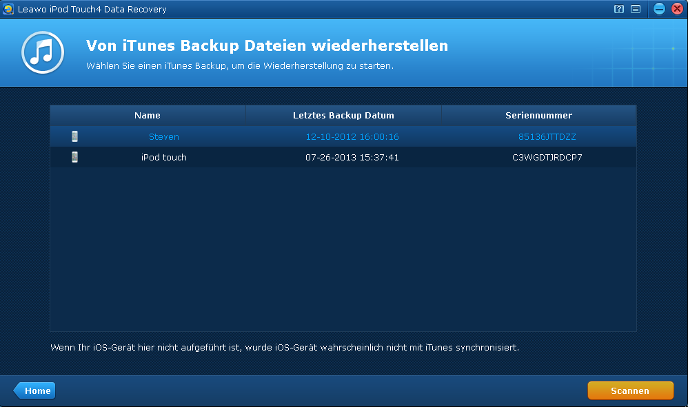 Nach wenigen Sekunden werden alle verfügbaren iTunes Backups aufgelistet. Wählen Sie das Backup Ihres iPhones und klicken Sie auf “Scan” um es nach Daten Ihres iPhones zu durchsuchen.