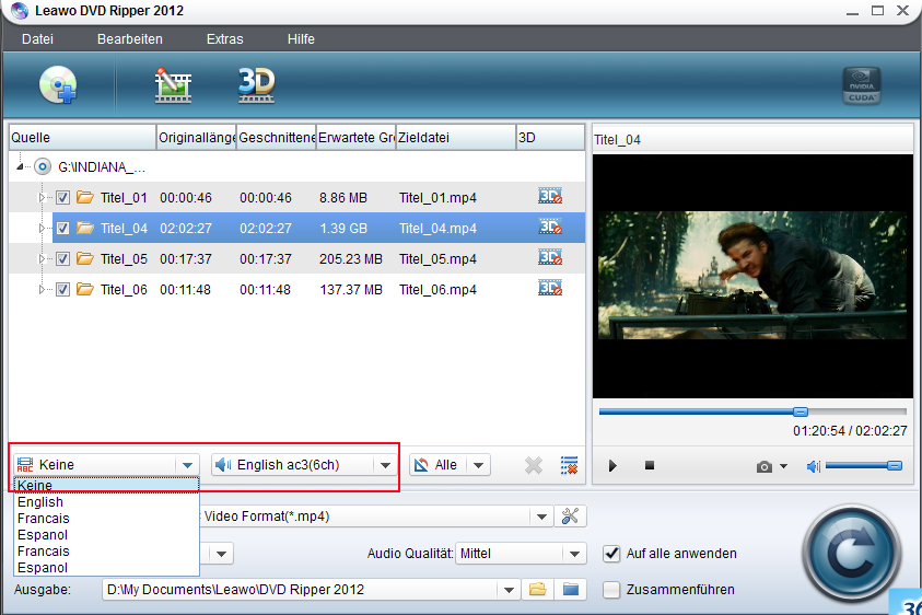 2. Die meisten DVDs verfügen über Untertitel und verschiedensprachige Tonspuren. Mit dieser Software können Sie auswählen, welche Tonspuren und Untertitel übernommen werden sollen. Sie können die Auswahl treffen, indem Sie “zu konvertierende Untertitel” und “zu konvertierende Tonspuren” klicken.