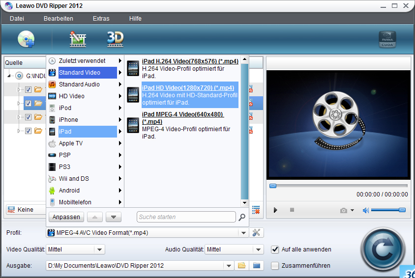 Um Ihre DVDs in ein Format zu konvertieren, welches vom Nexus 7 2 erkannt wird, klicken Sie auf “Profile” und wählen Sie ein vom Nexus 7 2 unterstütztes Format wie MP4.