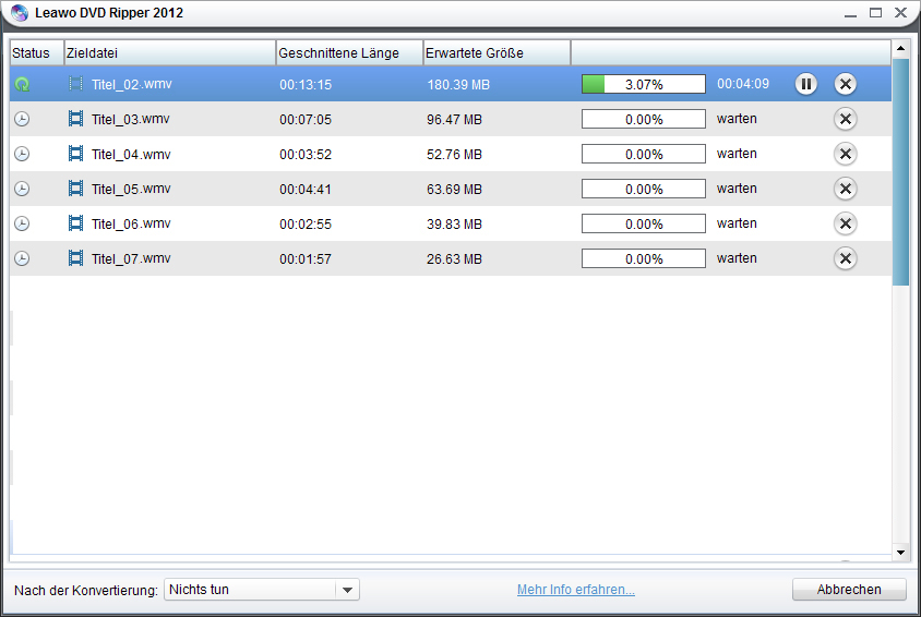 Nun zum letzten Schritt: Klicken Sie auf den großen “Konvertieren” Button um die Umwandlung von DVD zu Nexus 7 2 zu starten. Im Menü unten kann die Umwandlung verfolgt werden. Nach der Konvertierung können alle gerippten DVDs auf Ihr neues Nexus 7 Tablet übertragen und von nun an überall angesehen werden.