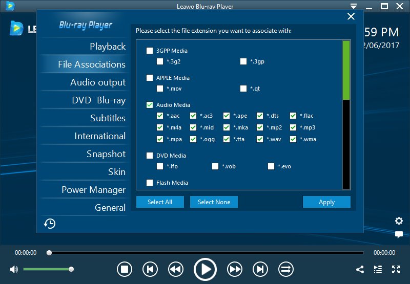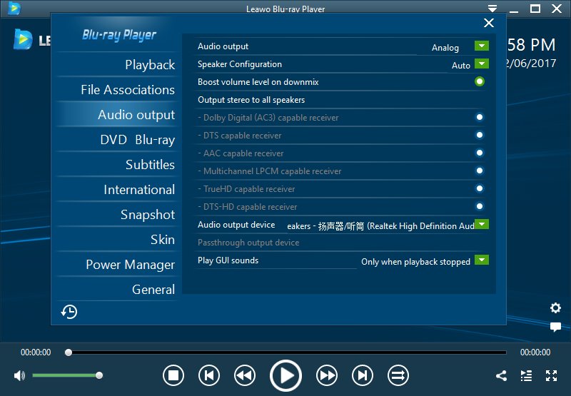 Schritt 2: Klicken Sie rechts unten auf das Einstellungssymbol, um die Einstellungen von Playback, File Associations, Audio Output, DVD Blu-ray, Untertiteln, International, Snapshot, Skin, Power Manager und General anzupassen.