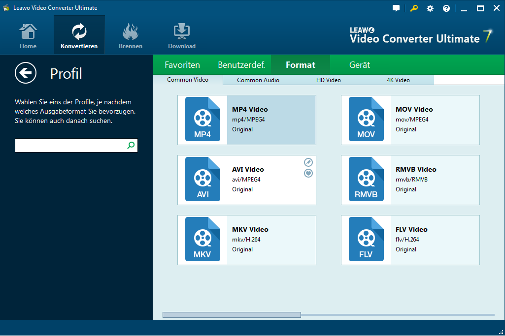 Hinweis: Wenn nötig, können Sie nach der Einstellung des Ausgabeformates das Dropdown-Menü erneut öffnen und dann “Bearbeiten” Option wählen, um das Profil Einstellungen Panel einzugeben und die Video- und Audio-Parameter von Ausgabeprofil anzupassen, darunter: Video Codec, Bit Rate, Seitenverhältnis, Auflösung, Framerate, Audiocodec, Audio-Bitrate, Kanal usw.