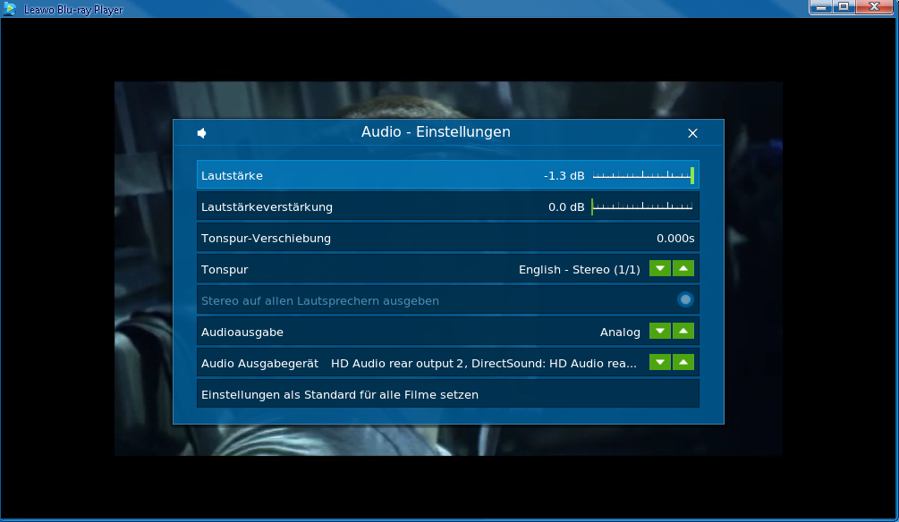 Um Audioeinstellungen vorzunehmen, klicken Sie einfach auf das kleine Audio Icon oben links im Wiedergabefenster. Sollte Ihr MKV Video DTS 5.1 Video enthalten und Sie möchten Ihr MKV Video damit wiedergeben, gehen Sie in die Audioeinstellungen und wählen Sie unter “Audio Stream” den Kanal DTS 5.1 an.