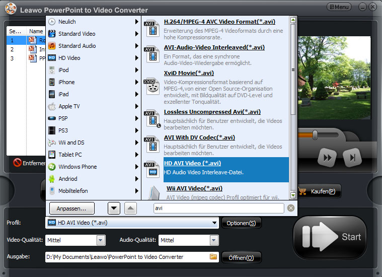Leawo PowerPoint to Video Converter macht Anwender unabhängiger von Microsofts PowerPoint. Er ermöglicht Ihnen, Ihre PowerPoint Präsentationen schnell und einfach in AVI, sowohl in SD- also auch in HD-Auflösung, umzuwandeln, damit Sie Ihre Präsentationen in Videoformat auf allen Multimedia-Playern mit Ihren Freunden genießen oder auf Youtube, Ihre Homepage oder Blog verbreiten können. Alle Animationen, Überblendungen und Soundeffekte werden in dem konvertierten AVI-Video behalten. Darüber hinaus können Sie Hintergrund Musik, Wasserzeichen hinzufügen.