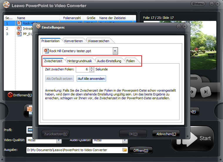 Um verschiedene Anforderungen der Nutzer zu erfüllen, bietet dieser PowerPoint to Galaxy Note Converter noch mehrere Einstellungsmöglichkeiten, z.B. die Zeitdauer zwischen einzelnen Folien einstellen, Hintergrund-Musik hinzufügen, das Seitenverhältnis der Folien beibehalten und etc.