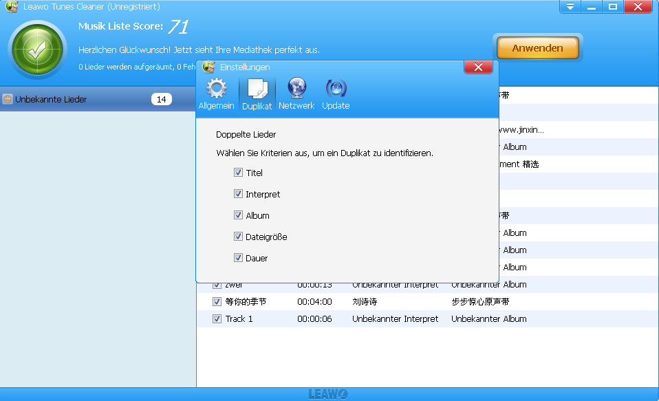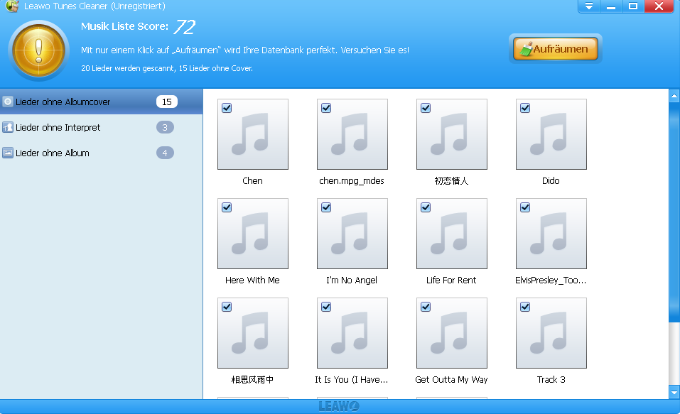 Ein professionelles iTunes Reinigungsprogramm könnte Ihnen dabei helfen, diese Arbeit leichter durchzuführen. Dafür können Sie den Leawo iTunes Cleaner verwenden, ein Experte in Sachen Reinigungsprogramm. Es hilft Ihnen doppelte Songs zu löschen.