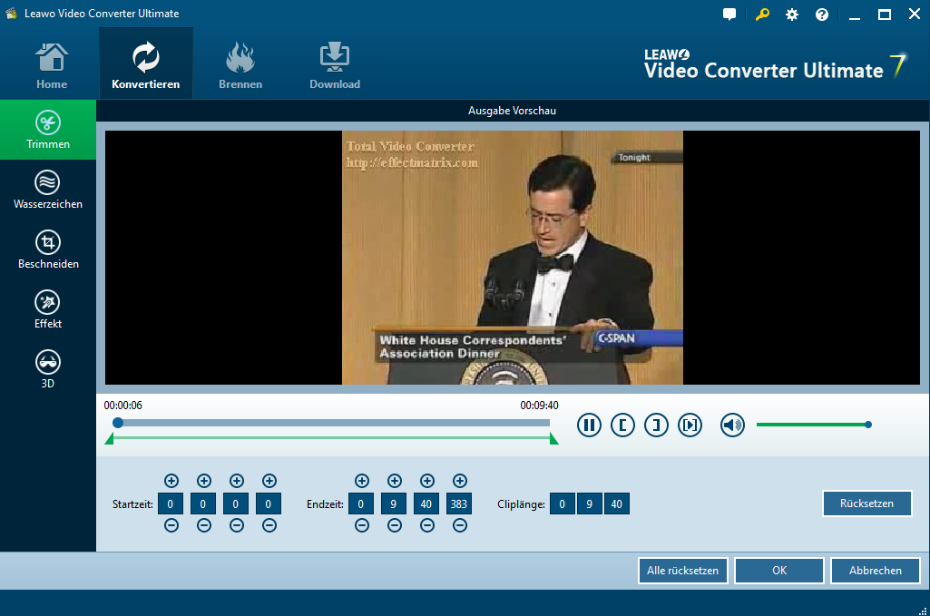Im Trimm-Tab können Sie die zwei Begrenzer auf der Wiedergabeleiste ziehen. Klicken Sie Begrenzer Tasten unten oder geben Sie Millisekunden-Zeit Indizes ein, um die Videolänge zu trimmen.