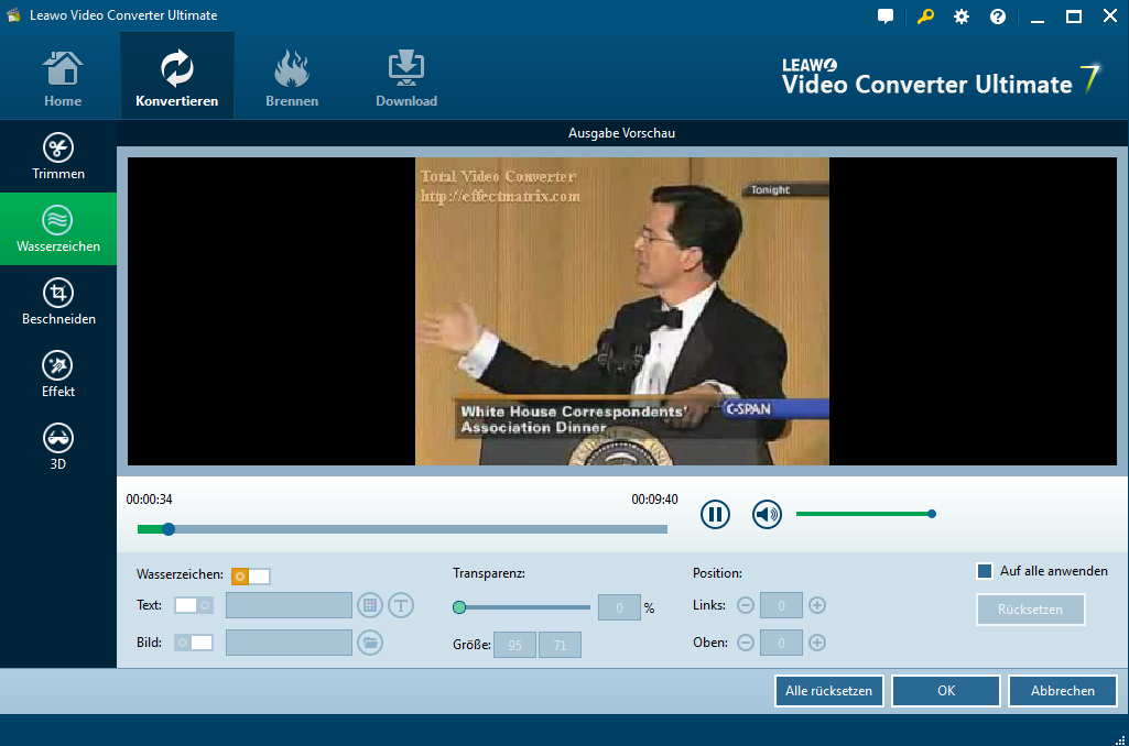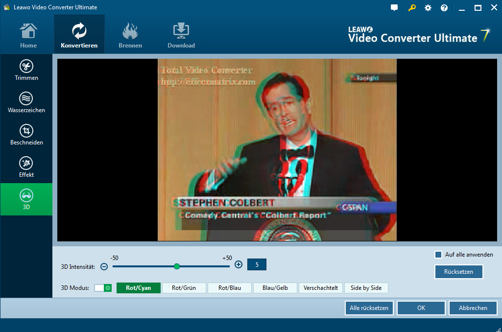Diese Video Converter Ultimate bietet auch 2D zu 3D Konvertierung. Sie können 2D-DVD / Video zu 3D-Video in verschiedene Formate frei konvertieren. 3D-Effekte wie: Rot / Cyan, Rot / Grün, Rot / Blau, Blau / Gelb, Verzahnt, Seite an Seite. 3D-Tiefe kann auch verstellt werden. Sie können 3D-Effekt auf dem Video Bearbeitungspanel wählen. Sofortige Vorschau von 3D-Effekt ist auch verfügbar.