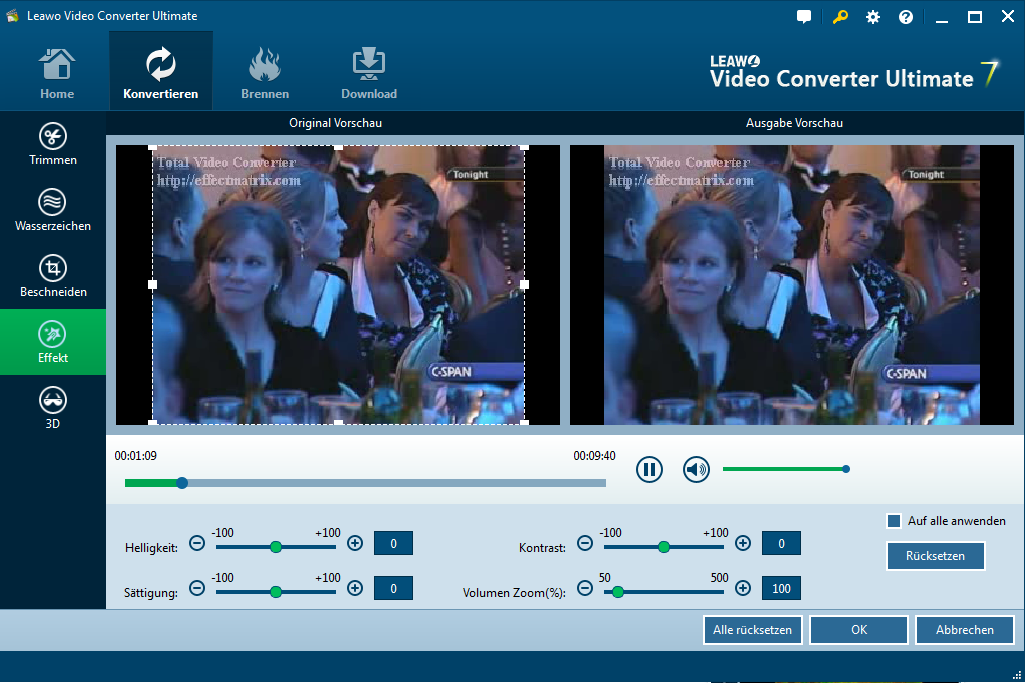 In Effect Registerkarte ziehen Sie die Bars auf Helligkeit, Kontrast, Sättigung, um Video-Effekt einzustellen. Das Volumen Zoom kann auch geändert werden. Sie können sich entscheiden, Ihre Wahl an alle zu verwenden oder nicht.