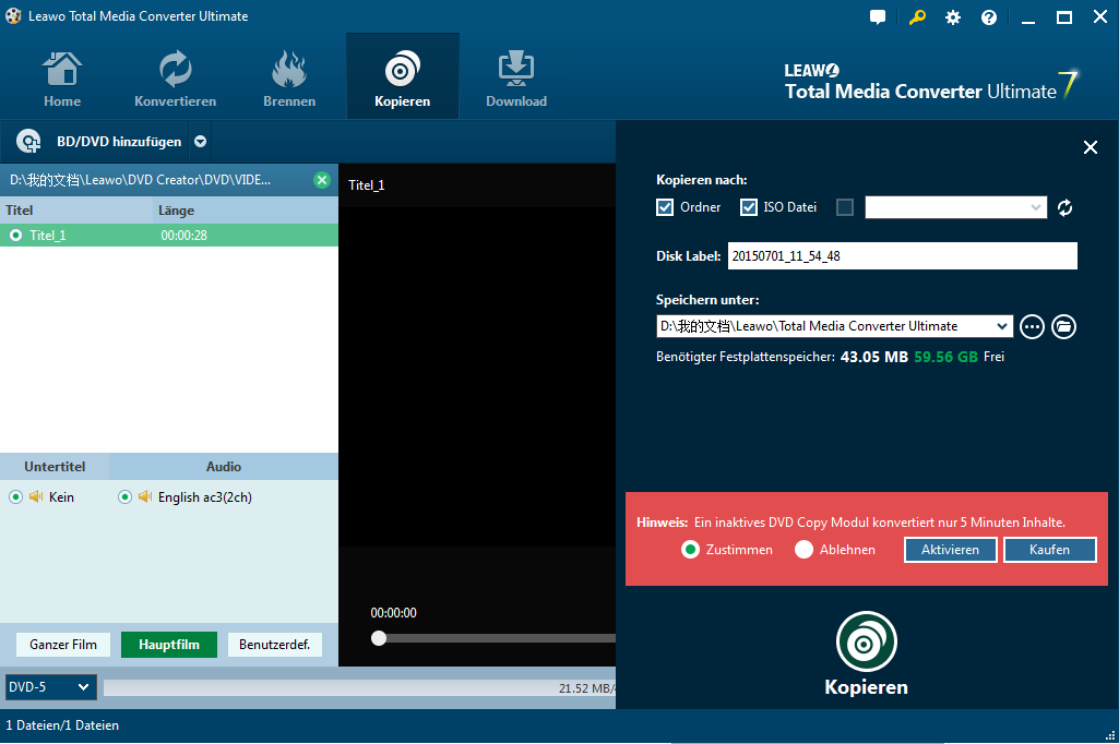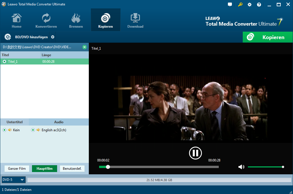 Gehen Sie zum Tab “Kopieren”, und klicken Sie dann auf “Blu-ray / DVD hinzufügen”, um die Quell-Blu-ray-Filme hochzuladen. Nachdem wählen Sie einen Kopiermodus aus “Full Film-“, “Hauptfilm-” und “Benutzerdefinierter-Modus” auf der linken Seite des Programms. Unter Hauptfilm- und Benutzerdefinierten-Modus können Sie Untertitel und Audiospuren für die Ausgabe wählen. Wählen Sie den Ziel-Disc-Typ an der Unterseite. Sie können die geladene Blu-ray-Filme mit dem eingebauten Player auf der rechten Seite abspielen.