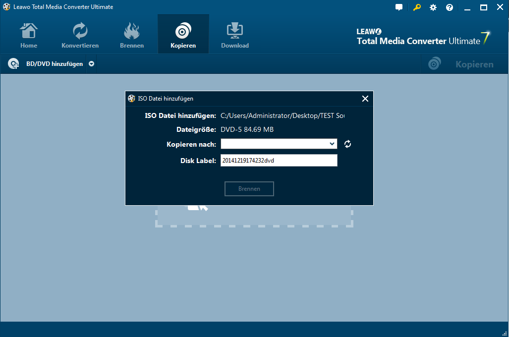 Nach dem Laden von Quell-ISO-Datei, im Popup “ISO-Datei hinzufügen” Fenster stellen Sie “Kopieren zu” und “Disc-Label” ein. Sie sollten zunächst eine leere, beschreibbare Disc in das Disc-Laufwerk einfügen. Und dann wird das Programm sie als Ziel im “Kopieren zu” Feld zeigen. Klicken Sie auf die Schaltfläche “Brennen” im “ISO-Datei hinzufügen” Fenster, um Kopieren ISO-Datei auf Disc zu starten.