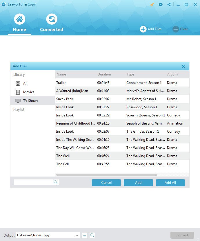 Die Bildschirm-Aufnahme-Methode ist schon ausgeschlossen, mit der man verlustfrei iTunes Video DRM entfernen kann. Stattdessen wenden wir die verlustfreie iTunes DRM Entfernungssoftware an. Hier werde Ihnen Leawo TunesCopy vorstellen. Als verlustfreie DRM-Entfernungssoftware für iTunes hilft Leawo TunesCopy, iTunes DRM verlustfrei zu entfernen und iTunes-Videos verlustfrei zu konvertieren. Erstens entfernt die Software DRM aus iTunes M4V Videos. Dann spielt die Software die Rolle eines DRM-Medienkonverters, der iTunes Videos verlustfrei konvertiert, indem er M4V zu MP4 konvertiert.