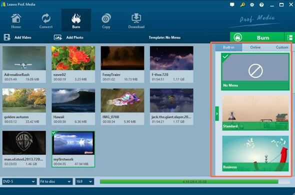 Schritt 4: Stellen Sie das Disc-Menü ein. Das ist optional. Sie können aus der rechten Seitenleiste wählen: Standard, Business, Education, Childhood, Holiday, etc. Oder Sie können das Disc-Menü mit Ihren eigenen Bildern und Audios selbst definieren.