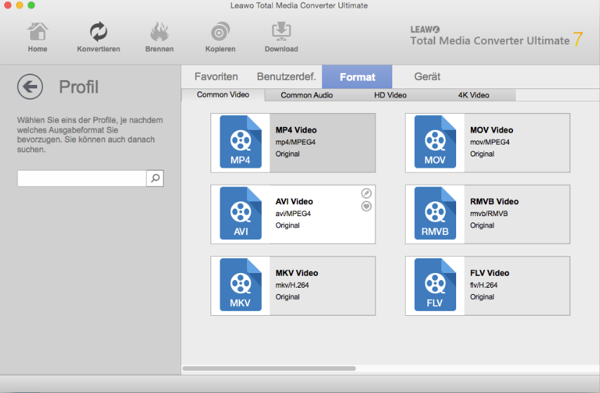 Klicken Sie auf das Dropdown-Menü neben dem “Foto hinzufügen” und wählen Sie dann Option “Ändern”, um die Profilplatte einzugeben, wo Sie ein Format als Ausgabeformat wählen können. Sie können von “Format” oder “Gerät” Gruppe wählen, bestimmte Formate in “Favoriten” hinzufügen, und Profile anpassen, um sie in “Benutzerdef.” Gruppe hinzuzufügen.