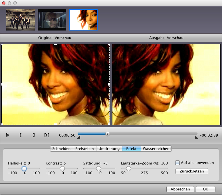 Effekt: Klicken Sie auf die “Effekt”-Schaltfläche, um Helligkeit, Kontrast und Sättigung einzustellen.