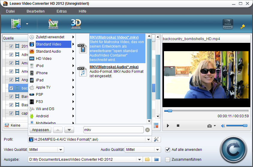 Matroska ist ein neulich immer populärer werdendes Containerformat für Audio- und Videodateien. Matroska Videodateien hat die Endung .mkv. Dank seiner Flexibilität und zahlreicher Zusatzfunktionen ist Matroska ein ideales Container für HD-Medien. Deshalb werden mehr und mehr MKV unterstützte 3D-Geräte auf den Markt gebracht. Um HD Videos auf solchen 3D-Geräten zu genießen benötigen Sie einen Converter, was Sie ermöglicht, 2D HD Videos in 3D MKV zur Wiedergabe auf den 3D-Geräten zu konvertieren. Und Leawo Video Converter HD ist ausgerechnet Ihre beste Wahl.