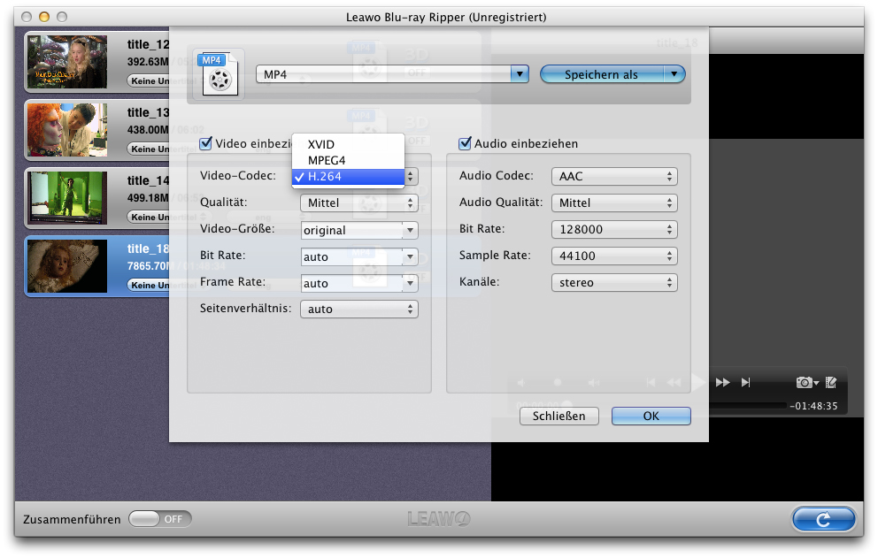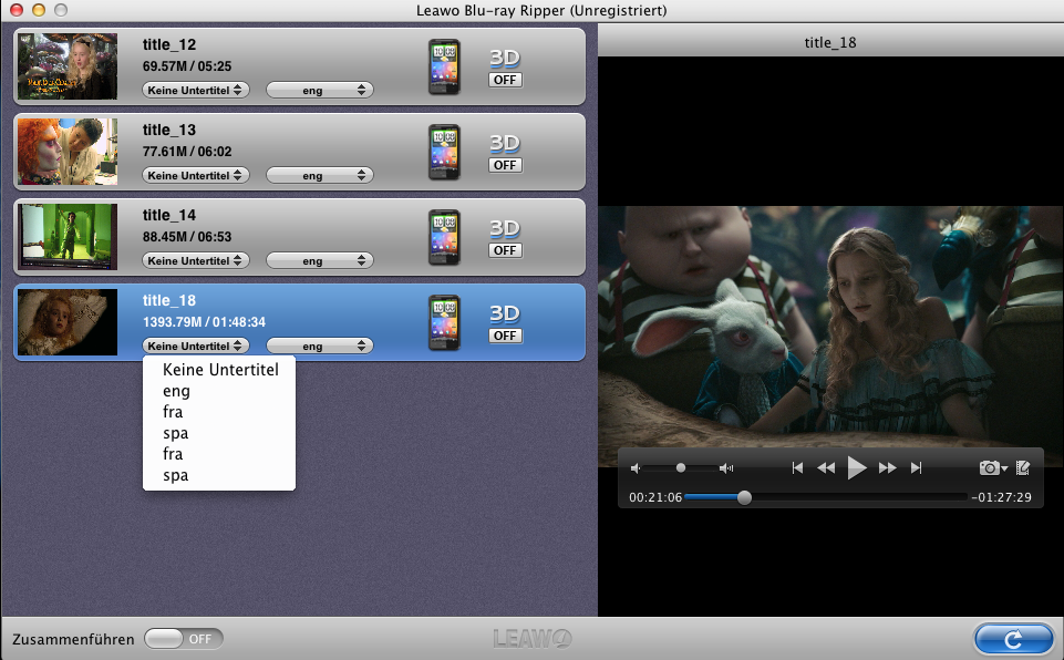 Laden Sie Leawo Blu-ray Ripper (Mac) zuerst herunter und nach der Entpackung der dmg-Datei starten Sie den Kindle Fire Blu-ray Ripper und importieren Sie Blu-ray Filme (Blu-ray Disc oder Blu-ray Ordner ). Im linken Teil bekommen Sie eine Überschau über die zu rippenden Blu-ray-Titel. Mit einem Doppeltklicken auf einen beliebigen Titel können Sie eine Vorschau machen. Unter jedem Titel befinden sich noch zwei Balken, wo sie zusätzlich die bevorzugte Tonspuren und Untertitel für das Ausgabe-Video auswählen können.