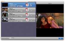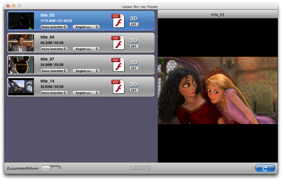 Im den linken Teil der Programmoberfläsche wird alle angehakten Blu-ray Filmtitel aufgelistet. Doppelklicken Sie einen zu konvertierenden Titel, dann können Sie ihn in dem eingebauten Player anschauen. Unter jedem Titel befinden sich noch zwei Balken, wo sie zusätzlich die bevorzugte Tonspuren und Untertitel für das Ausgabe-Video auswählen können.