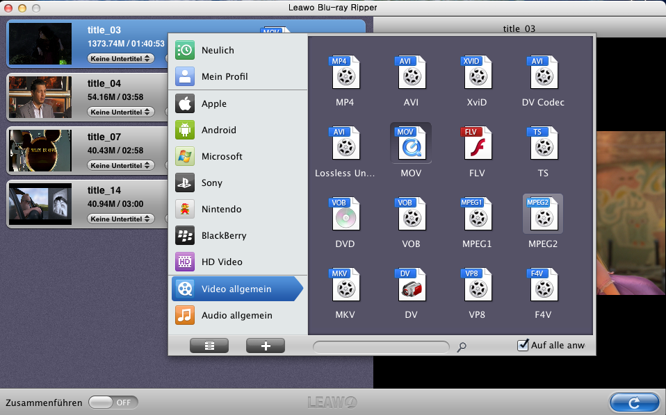 Leawo Blu-ray Ripper (Mac) ist ein professioneller und speziell für Mac OS entwickelter 3D Blu-ray Converter, der Blu-ray Filme rippen und mit hoher Geschwindigkeit in fast alle gängigen Formaten, sogar in 3D Format, konvertieren kann, zum Beispiel Blu-ray in MP4, Blu-ray in AVI, Blu-ray in MKV, Blu-ray in MOV usw.. Darüber hinaus bietet Leawo Blu-ray Ripper (Mac) noch Zahlreiche Bearbeitungsfunktionen, damit Sie die Blu-ray Filme durch Schneiden, Freistellen, Effektänderungen noch verfeinern können.
