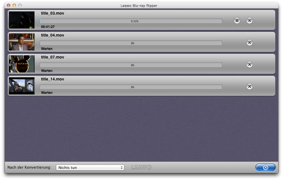 Nachdem Sie fertig eingestellt haben, staten Sie das Konvertieren von Blu-ray in MP4/AVI/MKV/MOV durch einen Klick auf das blau Symbol unter dem eingebauten Player auf der Hauptoberfläsche. Batch-Konvertierung und Multithreading werden auch unterstützt. In weniger Zeit bekommen Sie den Blu-ray Film in den beliebten Videoformaten.
