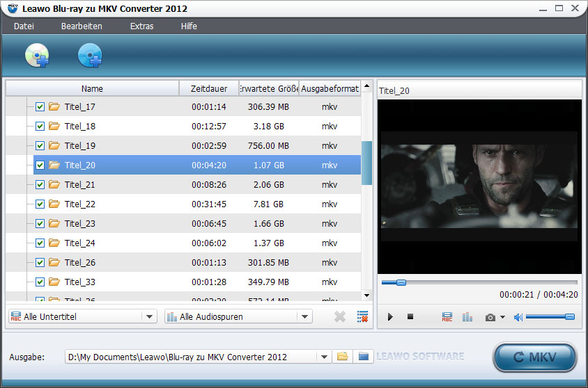 Leawo Blu-ray zu MKV Converter ist absolute Ihre beste Wahl. Mit diesem Blu-ray zu MKV Converter können Sie Blu-ray Disk und Blu-ray Ordner mit hoher Geschwindigkeit verlustfrei ins MKV-Format auf Ihrer Festplatte umwandeln. Dann können Sie HD MKV-Videos z.B. auf dem PC, auf dem HD TV genießen.