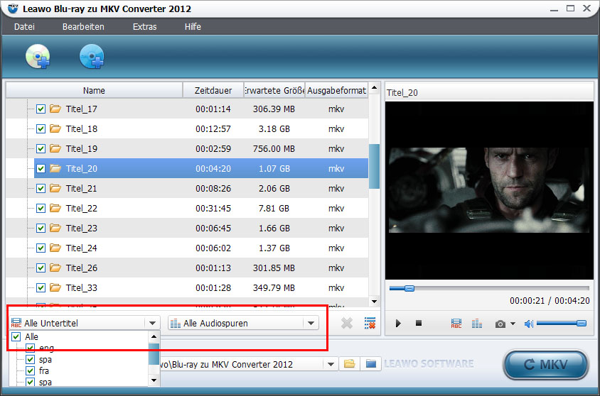 Um den besten Effekt zu erzielen, können Sie eine Vorschau machen. Sie finden die Steuerelemente mit „Untertitel“ und „Audiospuren“ unter dem Vorschaufenster. Und jedesmal können Sie einen Titel anhaken und den Anzeigeffekt ansehen. Der Wechsel zwischen verschiedenen Ton- und Untertitel-Spuren gelingt unkompliziert.